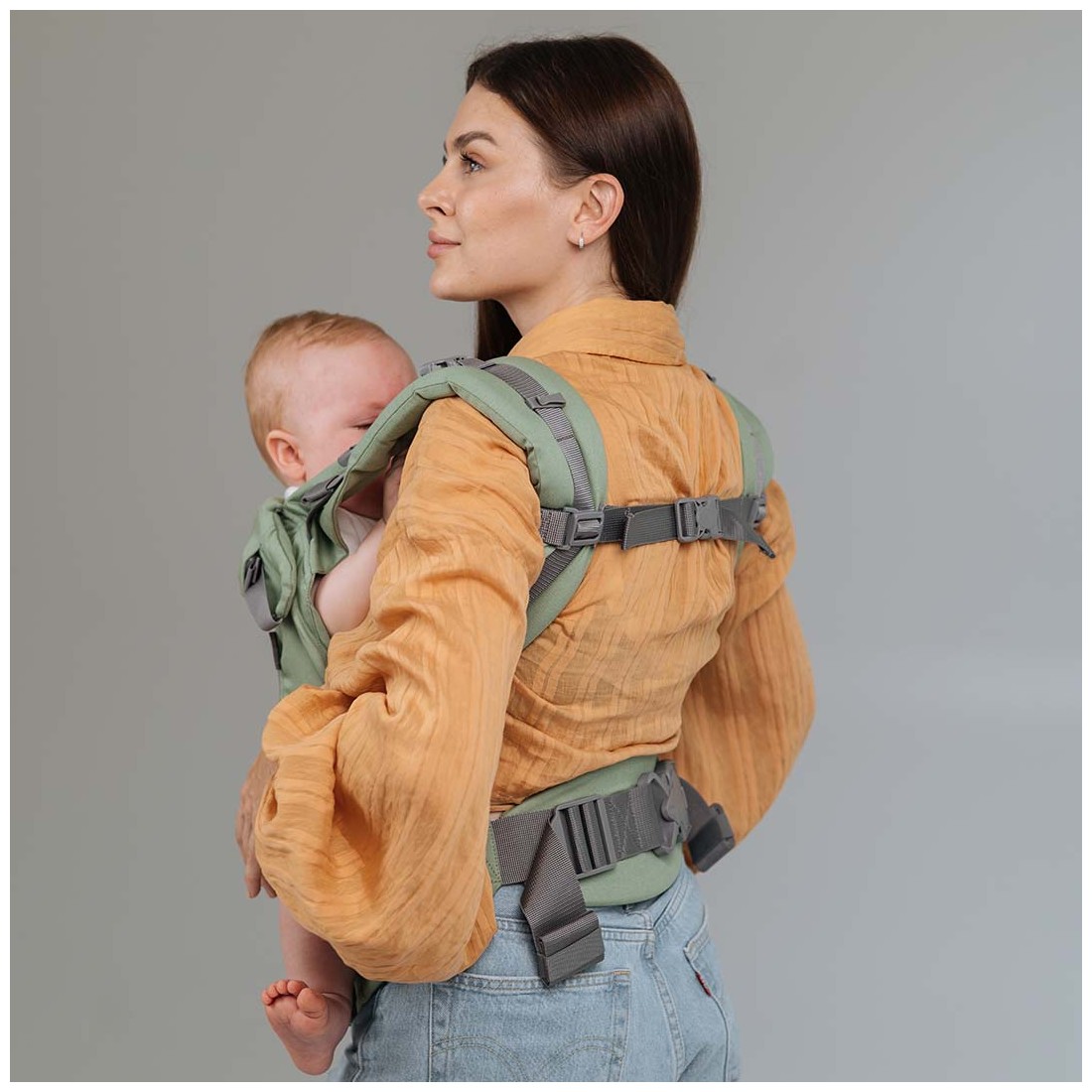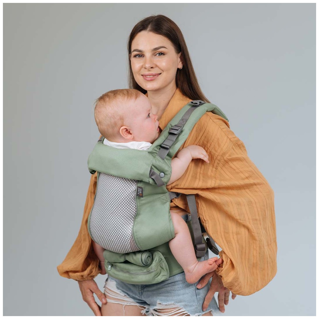 If your baby cannot sit unassisted, we recommend the Love and Carry One model, which provides a more ergonomic position for the baby. It features two strap configuration options and the ability to apply direct support to the spine.