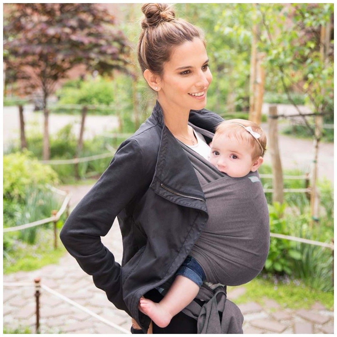 Madre porteando a bebé pequeño con fular elástico de algodón Moby Slate