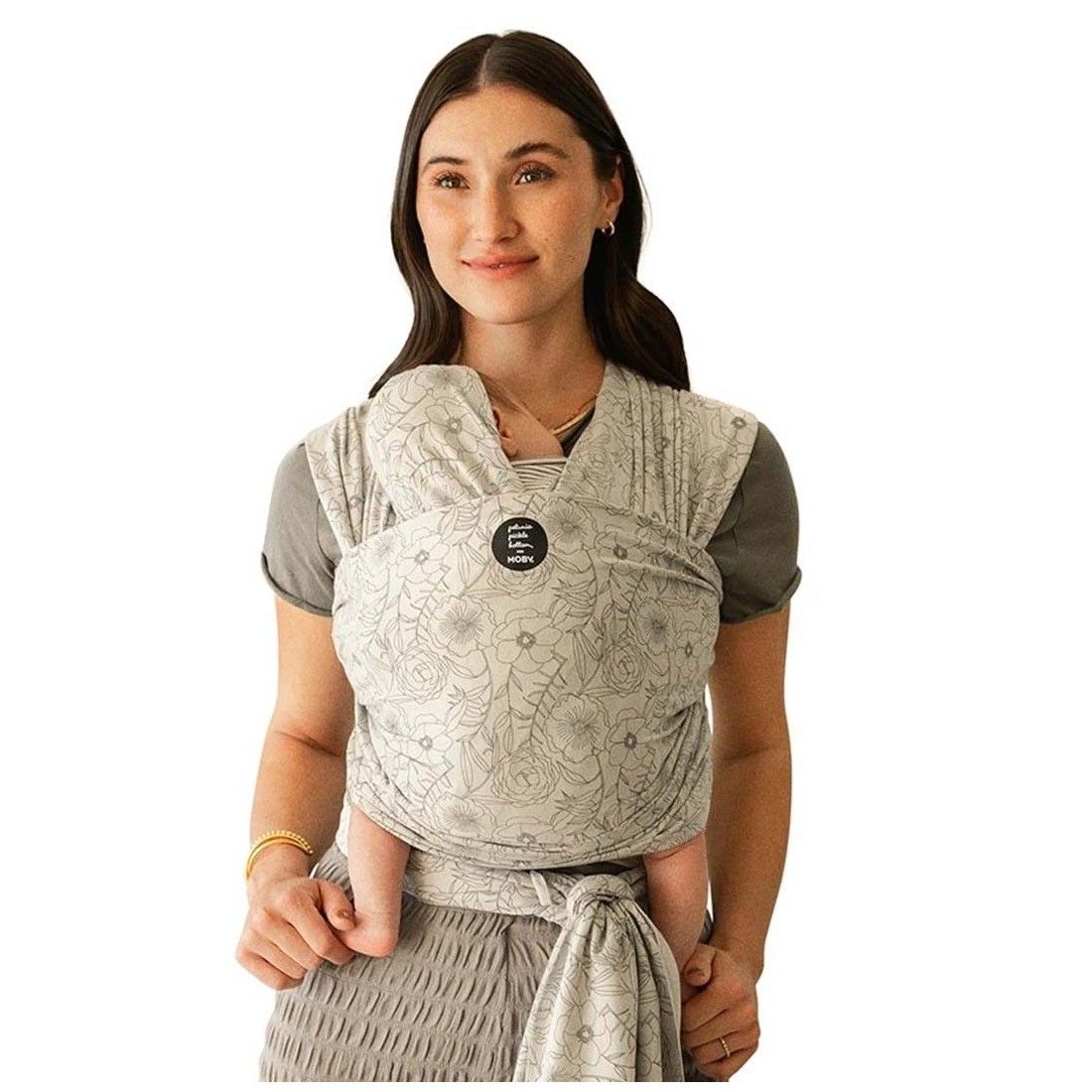 Madre porteando a bebé pequeño con fular elástico de algodón Moby Seaside Poppies