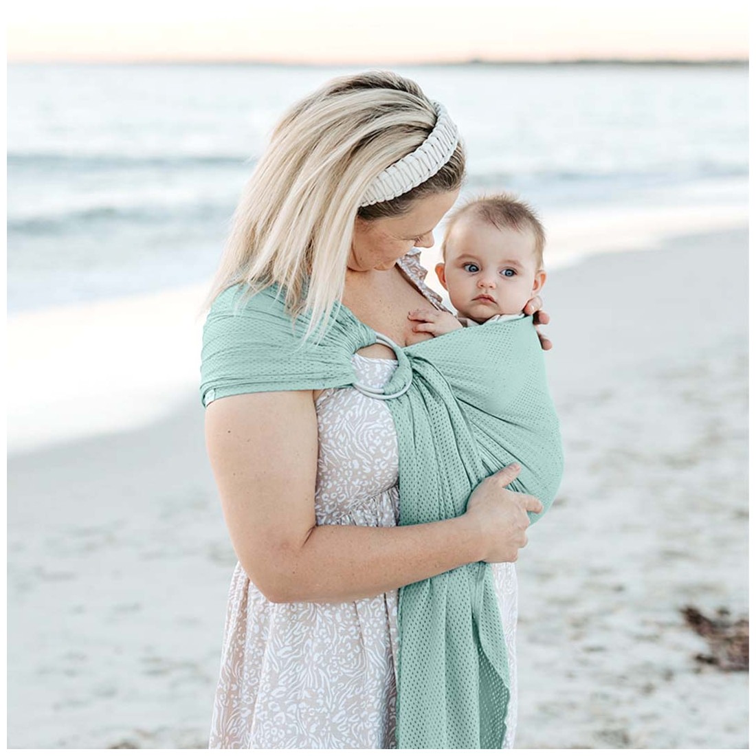 Bandolera Quokkababy en acción: madre y bebé en la playa